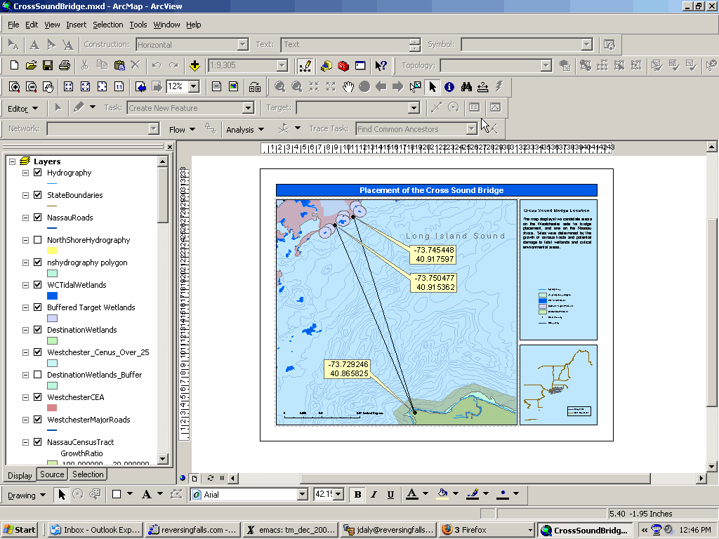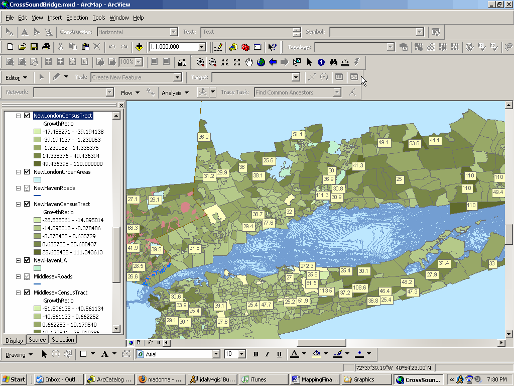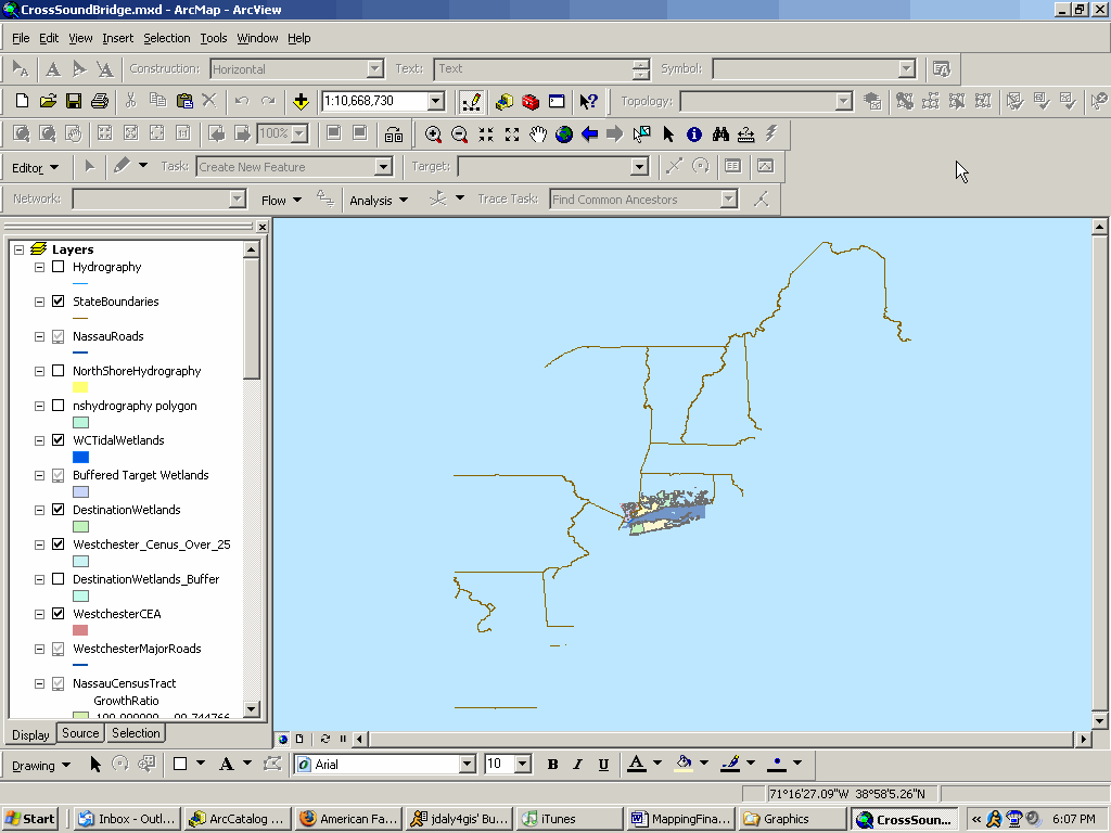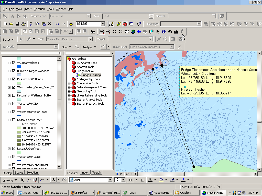 The notion of a bridge spanning Long Island Sound has been discussed for a few decades now. Mostly it falls into 'what if?' or Extreme Engineering topics of conversation, but the ever-expanding city metropolitan population, and the congestion and traffic snarls already on city bridges, roads and tunnels make this a relevant topic today. It may even become a necessity in the near future. Since the placing of such a bridge is dependent upon population growth, ecological concerns and the location of major roads, this project is a very good subject for a GIS model.