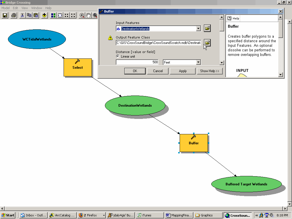 Find Bridge Areas: To find locations to place the bridge, tidal wetland areas on would have to be avoided as much as possible. To do this the area with the least amount of wetlands is located, and the existing wetlands buffered to an extent of 500 feet. The order of operation to do this in ArcMap is as follows:
