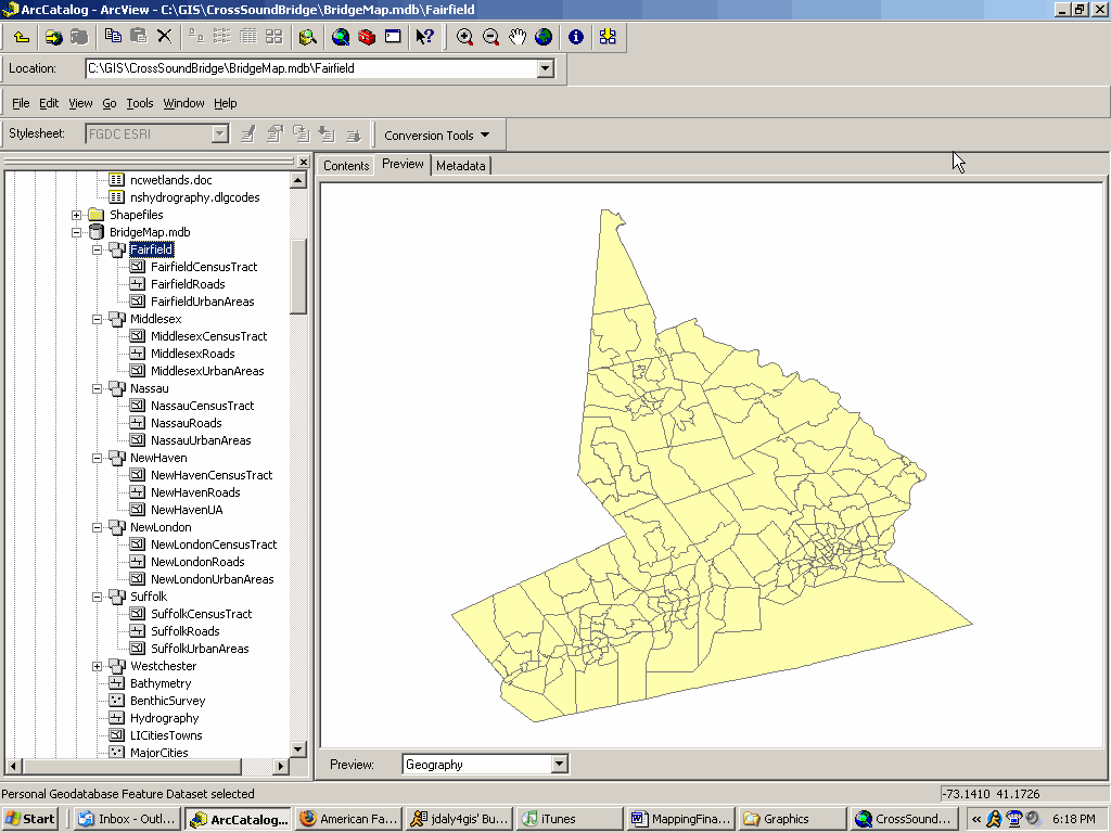 Ecological Concerns: Bathymetry and Benthic data were downloaded and imported from links on the USGS Science Center at Woods Hole site. This data has a Projected Coordinate System and a False Easting. A new Projected Coordinate System named Bridge_Coordinate_System was created for this and future imports for LIS ecological studies.