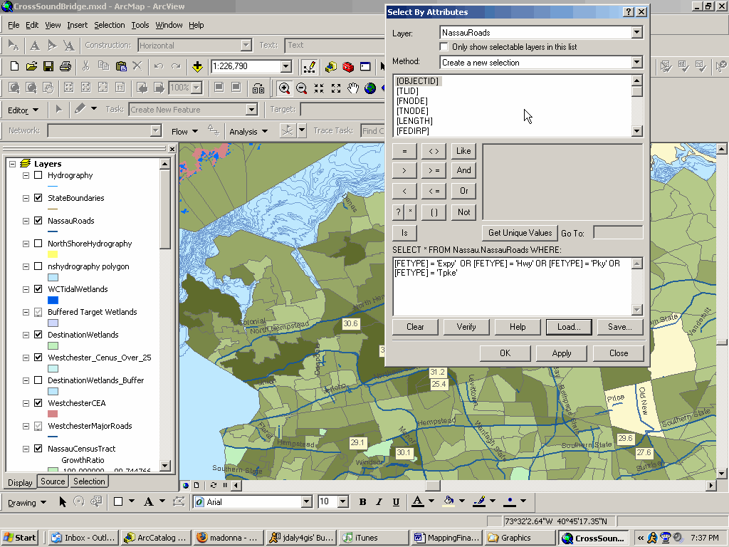 Define Major Roads: The major roads shapefiles were exhaustive in detail. To pick the most important roads from these features, a Selection by Location was used with a query to display only highways, parkways, turnpikes and interstates.